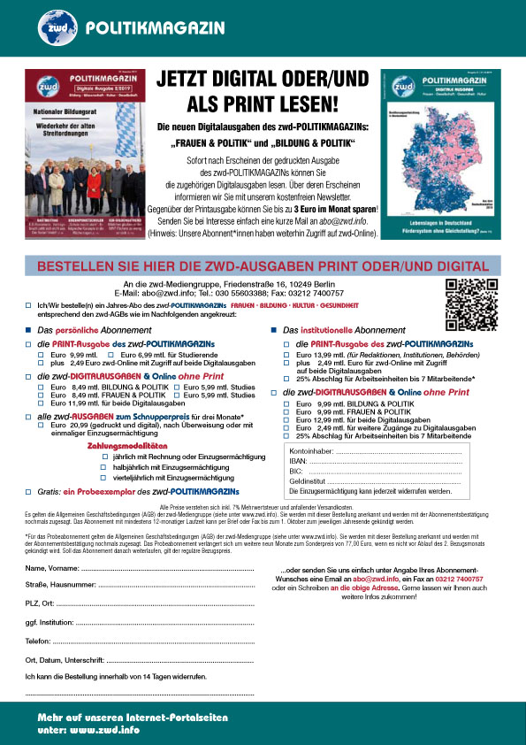 Die zweiten Digitalausgabe zwd FRAUEN & POLITIK steht jetzt zum Download allen interessierten Leser*innen zur Verfügung. Von diesem Jahr an ergänzen Digitalausgaben für die Printausgaben.