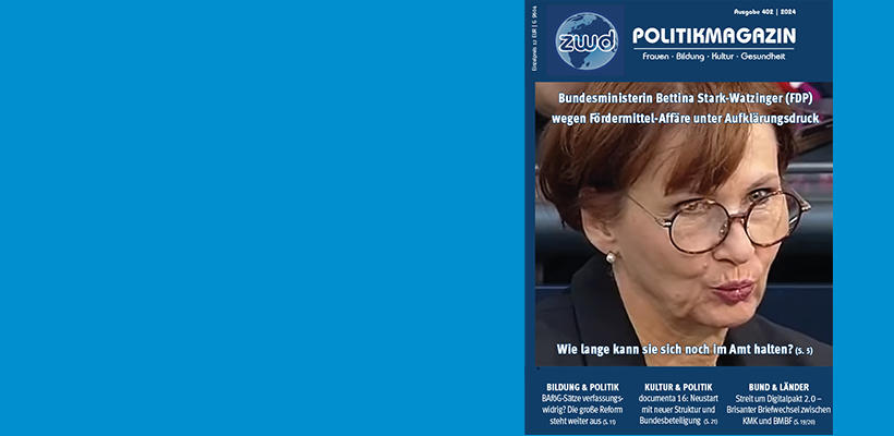 Die Titelgeschichte im zwd-POLITIKMAGAZIN 402 (Print) fragt, wie lange sich Bundesbildungsministerin Bettina Start-Watzinger (FDP) noch im Amt halten kann. Ihr droht Anfang September ein Spießroutenlaufen im Bundestag wegen ihres Verhaltens in der Fördergeldaffäre. Wir ziehen ein Resümee nach Inkrafttreten der 29. BAföG-Novelle. Außerdem analysieren wir den Briefwechsel zwischen KMK und BMBF zum Digitalpakt 2.0. Mit dem Neustart der documenta (Ausstellung 16) vor dem, Hintergrund des Wiedereinstiegs des Bundes) beschäftigt sich die Rubrik "KULTUR UND POLITIK".
