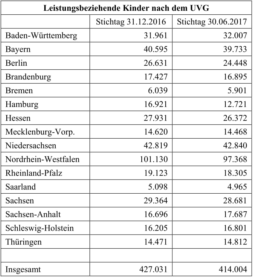Genaue Werte (nach der UVG-Geschäftsstatistik des BMFSFJ), aufgeschlüsselt nach Bundesländern, entnehmen Sie bitte der folgenden Abbildung: