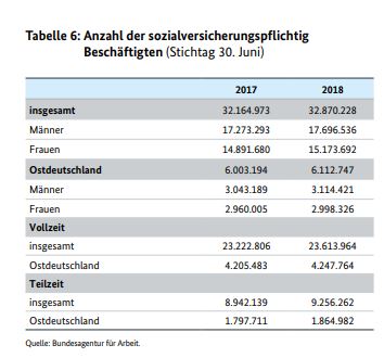 Die Zahl der Erwerbstätigen nahm mit 44,9 Millionen im Jahr 2018 weiter zu. Auch stieg die Zahl der sozialversicherungspflichtig Beschäftigten in Ostdeutschland von 2017 auf 2018 an. Von diesem Zuwachs profitierten allerdings mehr männliche (mit einem Plus von 2,3 Prozent) als weibliche Beschäftigte (mit einem Plus von 1,3 Prozent).