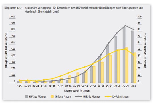Die Fallzahlen von Krebserkrankungen weisen altersspezifisch zwischen den Geschlechtern ebenfalls signifikante Unterschiede auf (siehe Grafik unten). Die steigenden Fallzahlen bei Frauen im Alter von 25 bis 55 Jahren im Vergleich zu ihren männlichen Altersgenossen machen dies deutlich. Diese Tendenz ist laut BKK-Report dadurch begründet, „dass gerade bei den geschlechtsspezifischen Krebserkrankungen die mittleren Erkrankungsalter unterschiedlich sind“. So setzt bei Frauen der Gebärmutterhals- und Brustkrebs recht früh ab 25 Jahren ein, während Prostatakrebs bzw. der bei Männern deutliche häufigere Harnblasenkrebs eher ältere Personen ab Mitte 50 betrifft.