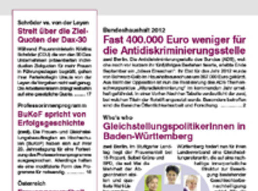 ZWD-MAGAZIN FRAUEN.GESELLSCHAFT UND POLITIK NR. 294 (2011) ERSCHIENEN : Finanzieller Aderlass schwächt die Antidiskriminierungsstelle des Bundes 26. April 3600 mehr...