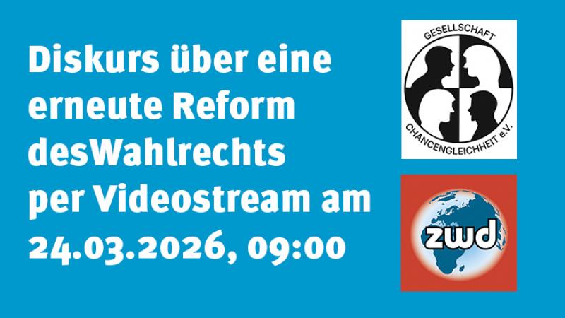 Auf Einladung der Gesellschaft Chancengleichheit treffen sich am 24. März 2026 (ab 09:00) Wahlrechtsexpert(inn)en der Bundestagsfraktionen von SPD, Grünen und Linken mit Expert(inn)en aus Wissenschaft und Zivilgesellschaft zu einem Fachgespräch über die Reform des Bundestagswahlrechts. Die Diskussionsveranstaltung im Tagungszentrum im Haus der Bundespressekonferenz auf Initiative von Prof. Dr. Robert Vehrkamp und zwd-Herausgeber Holger H. Lührig wird als Videostream übertragen. Vor Ort besteht eine Teilnahmemöglichkeit für eine begrenzte Zahl von Gästen. mehr...
