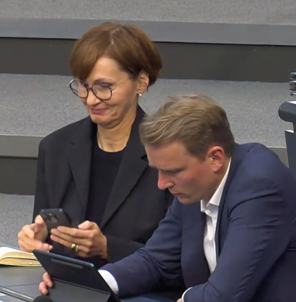 Sprecher:innen der Oppositionsfraktionen kritisierten, dass Bundesbildungsministerin Stark-Watzinger das Versprechen der Regierungserklärung von 2021 zu einer grundlegenden Reform der Bundesausbildungsförderung nicht erfüllt habe. Auch die Forderung nach ihrem Rücktritt wurde laut, da sie sich für die Belange der Studierenden nicht wirklich interessiere. Die Ministerin, soweit nicht mit dem Handy beschäftigt (Bild),