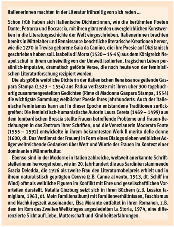 Die sensationellen Erfolge, welche die Bestsellerautorin Elena Ferrante, die in ihrer Identität überwiegend anonym bleibt, vor allem mit der sog. Neapolitanischen Saga (2001-2014) erwarb, die von einer lebenslangen Freundschaft zweier Frauen handelt, haben internationale Aufmerksamkeit für die Literatur der Italienerinnen erweckt. Das hat zu Neuübersetzungen wiederentdeckter Klassikerinnen beigetragen und – ein von der New York Times als Ferrante-Effekt bezeichnetes Phänomen – den literarischen Aufstieg einer Reihe junger Schriftstellerinnen eingeleitet, die in vielen ihrer teilweise mit renommierten Preisen dotierten Bücher Frausein, weibliche Beziehungen und Lebensentwürfe thematisieren, gesellschaftliche Stereotype, Erwartungen und Geschlechter-Rollen herausfordern.