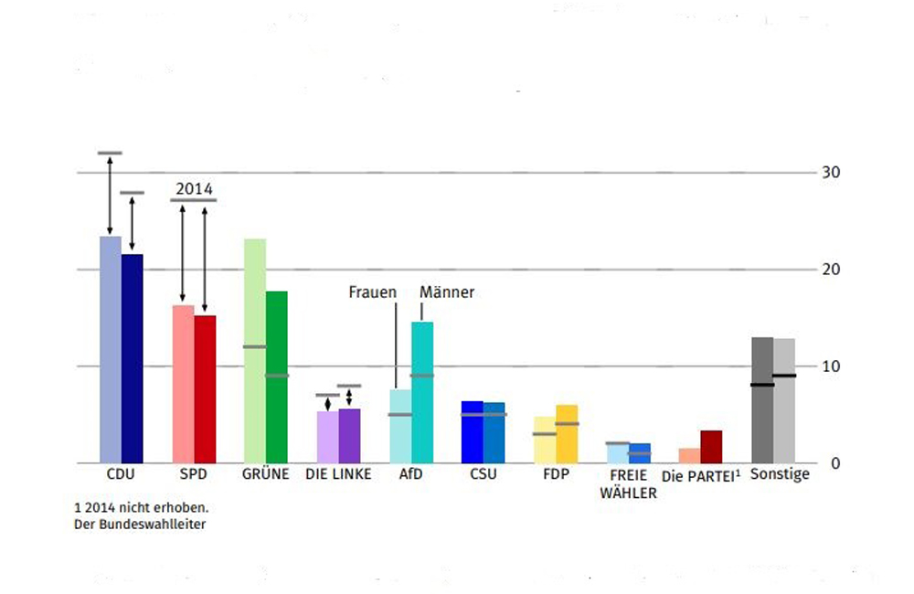 Das Stimmverhalten der Geschlechter unterschied sich bei der AfD noch erheblicher als bei den Grünen. Während fast 15 Prozent der Männer für die Partei stimmten, votierten nur 7,6 Prozent der Frauen für die sogenannte Alternative. Bei keiner anderen Partei variierte das Wahlverhalten zwischen den Geschlechtern so stark (7 Prozentpunkte). "Die Partei" wählten nur 1,5 Prozent der Frauen, aber mehr als doppelt so viele Männer votierten für sie (3,3%). Die Stimmanteile der Linken waren bei Männern (5,7%) und Frauen (5,2%) fast gleich; auch die Geschlechterdifferenz bei der FDP war gering (Frauen: 4,8%; Männer 6,1%).