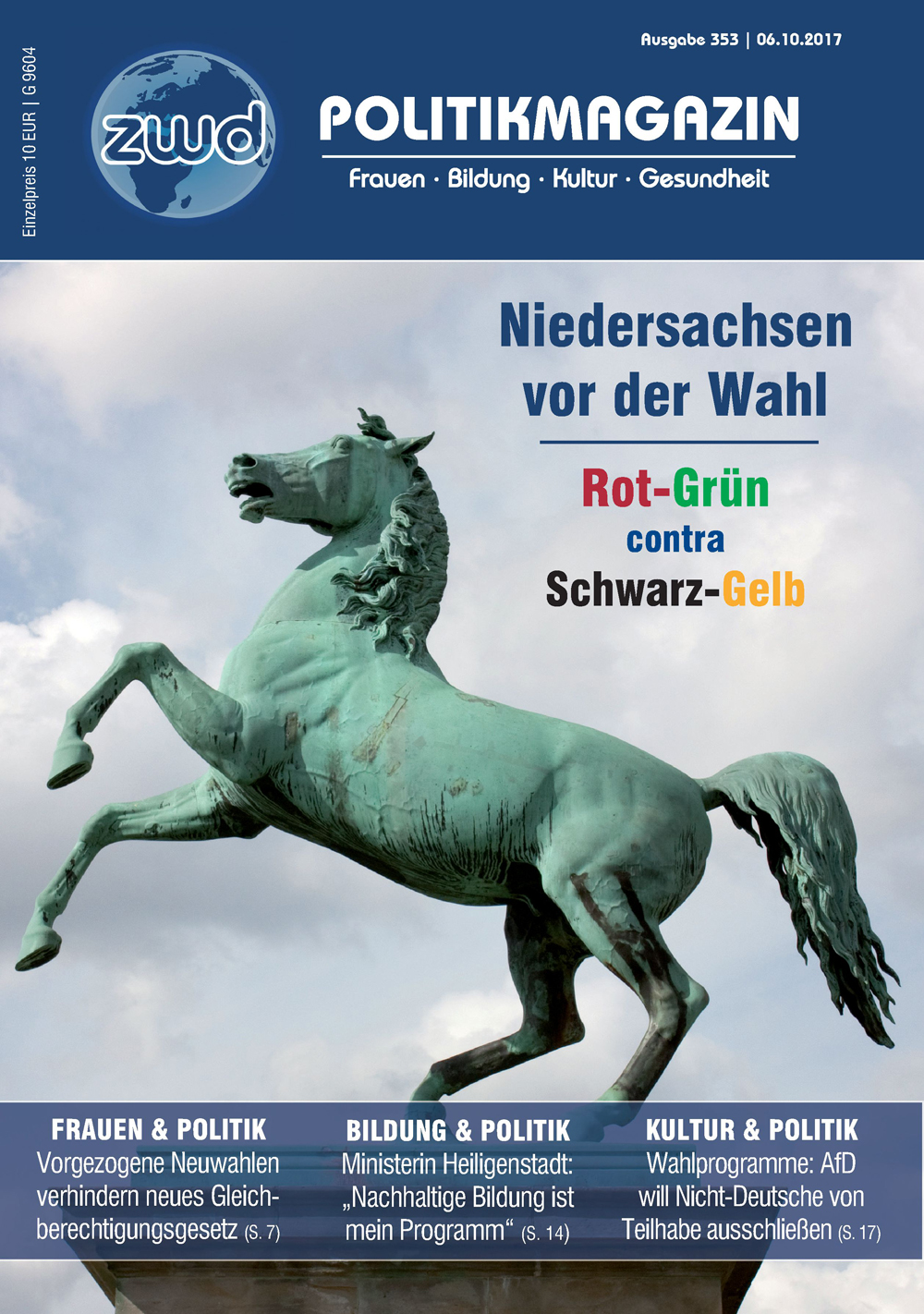zwd Hannover (ig/ds). Der Schock über den Einzug der AfD in den Deutschen Bundestag und die historische Wahlschlappe von CDU, CSU und SPD am 24. September ist noch nicht bewältigt, da steht nun schon die vorgezogene Landtagswahl am 15. Oktober in Niedersachsen an. Glaubt man den Demoskopen, deren Prognosen bekanntlich auch bei der Bundestagswahl im Hinblick auf CSU und CDU einerseits sowie AfD andererseits deutlich daneben gegangen sind, lägen SPD und CDU – jedenfalls nach der letzten repräsentativen Umfrage von Infratest dimap vom 28. September – nahezu gleichauf, wobei der Trend Zugewinne für die SPD und Verluste für die CDU anzeigt.
