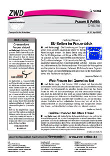 EU-Frauenseiten im Web; Informationsportal für ältere Frauen; Online-Rezensionen zu Frauen im Web : Supplement Nr. 25 27. April 2003 // zwd-Net-Service 3. Jahrgang Schwerpunkte dieser Ausgabe:Die EU-Seiten im FrauenblickFrauen im Web rezensiert: Querelles-NetSophia-Net: Informationen für ältere FrauenDatenbank Frauen- und GeschlechterforschungDiese Ausgabe herunterladen