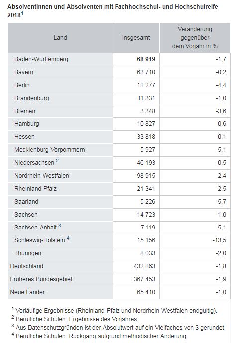 Weiter lassen sich große Unterschiede zwischen Ost und West beobachten (siehe Grafik). In den neuen Bundesländern sank die Zahl der Studienberechtigten 2018 um ein Prozent. Ein Plus von 5,1 Prozent an Hochschulzulassungen konnten demgegenüber die neuen Bundesländer Mecklenburg-Vorpommern und Sachsen-Anhalt verzeichnen.