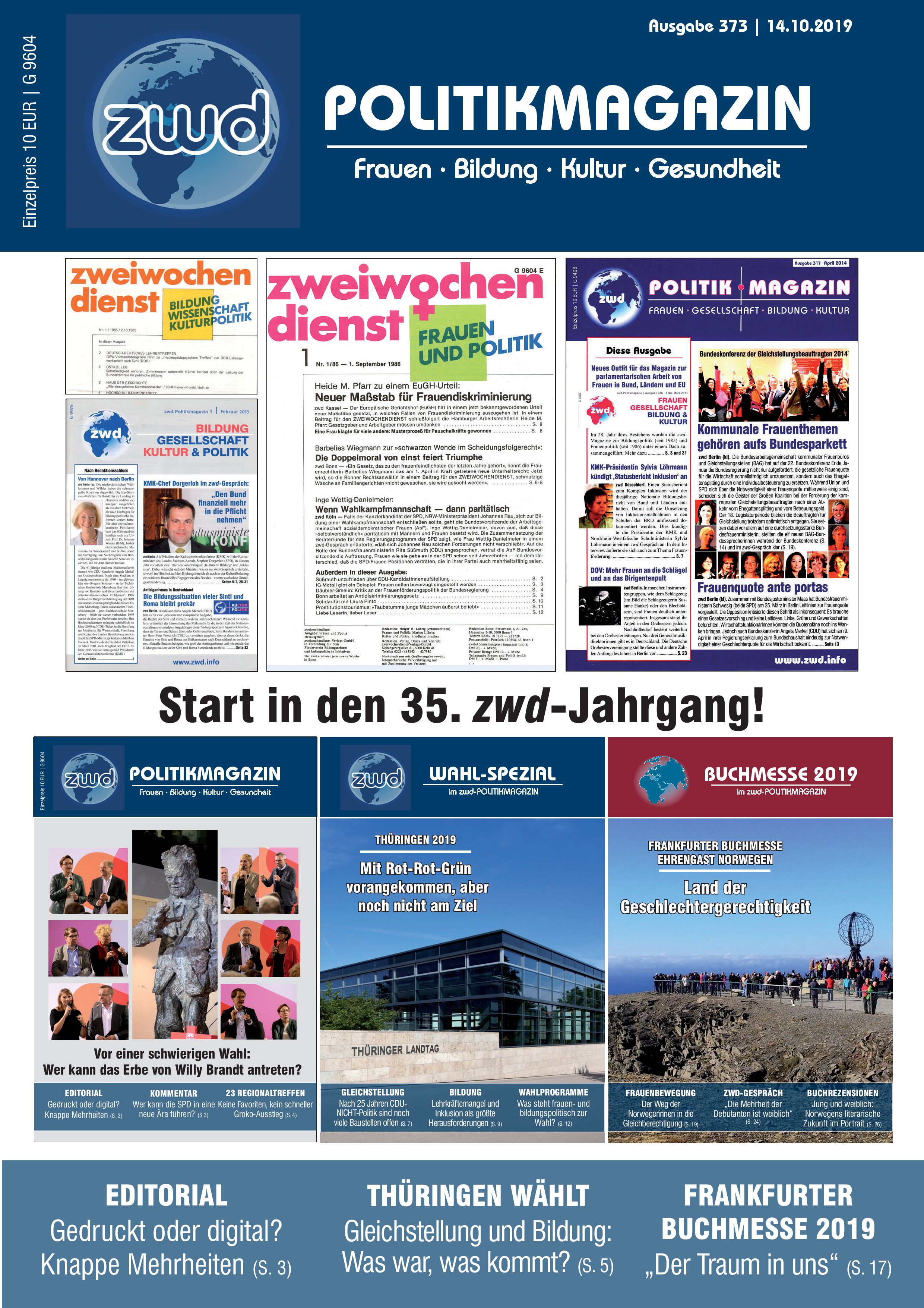 Liebe Leserinnen und Leser, im Fokus dieses Newsletters steht das neue zwd-POLITIKMAGAZIN Nr. 373. In der aktuellen Ausgabe blicken wir nach Thüringen: Anlässlich der kommenden Landtagswahlen am 27. Oktober haben wir analysiert, wie die Frauen- und Gleichstellungspolitik in dieser Legislaturperiode unter der rot-rot-grünen Landesregierung nach knapp 25 Jahren CDU-geführter Regierungszeit vorangekommen ist.  In einem 12-seitigen zwd-EXTRA zur Frankfurter Buchmesse 2019 haben wir das Gastland Norwegen aus frauenpolitischem Blickwinkel unter die Lupe genommen. Unser Titel lautet: "Land der Geschlechtergerechtigkeit". So beleuchten wir in einem Bericht zur Geschichte der Frauenbewegung, welchen Einfluss die norwegischen Schriftstellerinnen auf die frühen Durchsetzung der Frauenrechte hatten. Zudem haben wir mit Marta Breen, erfolgreiche Sachbuchautorin und engagierte Feministin sowie Heidi Marie Kriznik, Vorsitzende des Norwegischen Schriftstellerverbandes und ebenfalls mehrfach ausgezeichnete Autorin von Romanen, über die Rolle der Frauen in der modernen norwegischen Literatur gesprochen. Ferner stellen wir Ihnen einige ausgewählte Neuerscheinungen norwegischer Autorinnen vor. Anlässlich der Vorstellungsrunde der Bewerbungsteams für den SPD-Vorsitz befasst sich ein Kommentar von zwd-Herausgeber Holger H. Lührig mit der Frage, wie die Sozialdemokratie in eine neue Ära geführt werden kann. Seine Einschätzung: Die Partei hat bisher keine hinreichende Ursachenforschung für die Wahldesaster der letzten Jahre betrieben. Der SPD-Vorsitz wurde als "Wegwerf-Ware" behandelt. Eine neue Parteiführung braucht, um das Profil der Partei zu schärfen, mehr als nur Mut und Engagement, sondern muss auch die Entschlosssenheit unter die Unterstützung der Parteibasis, die Parteiarbeit neu zu strukturieren. An der Spitze unseres Nachrichtenüberblicks aus den zwd-Portalen steht die Berichterstattung zu einem Kongress im Bayerischen Landtag zu dem Frauenanteil in den Kommunalparlamenten. Wie die Zahlen belegen, sind Frauen in bayerischen Kommunalparlamenten auffallend unterrepräsentiert. In nicht einmal einem Zehntel der bayerischen Rathäuser besetzen Frauen die Chefposition, und in den über 2.000 kreisangehörigen Gemeinden leiten bloß 186 Bürgermeisterinnen die Verwaltungsgeschäfte. Für die im März 2020 stattfindenden Kommunalwahlen sollen deshalb mehr Frauen mobilisiert werden. Trotzdem hat sich die größere Regierungspartei, die CSU, auf ihrem Parteitag an diesem Samstag nicht dazu entschließen können, für die Arbeit in den Landkreisen eine Frauenquote vorzuschreiben. Drei Artikel in unserem Portal beschäftigen sich mit dem Thema Gewalt an Frauen. So berichteten wir über den Start des Bundesinvestitionsprogramms "Gemeinsam gegen Gewalt an Frauen", das insgesamt 120 Millionen Euro in die Verbesserung der Infrastruktur der Frauenhäuser und Beratungsstellen investiert. Ferner haben wir den Femizid an einer 19-jährigen südafrikanischen Studentin aufgegriffen, der eine Protestwelle ausgelöst hat. Mittlerweile fordern bis dato rund 590.000 Südafrikaner*innen in einer Petition die Wiedereinführung der Todesstrafe bei Verbrechen gegen Frauen und Kinder. Außerdem haben wir eine Dunkelziffer-Statistik der Menschen- und Frauenrechtsorganisation TERRE DES FEMMES vorgestellt, die einen Anstieg von Opfern weiblicher Genitalverstümmelung beklagt. Den Zahlen zufolge leben mehr als 70.000 betroffene Frauen in Deutschland. Dies ist ein Anstieg von acht Prozent im Vergleich zum Vorjahr. Die zwd-Redaktion wünscht Ihnen eine spannende Lektüre! Abonnent*innen können die aktuelle Ausgabe Nr. 373 im PDF-Format hier herunterladen. Noch kein*e Abonnent*in? Eine Übersicht unserer Abo-Modelle finden Sie hier. Der schnellste Weg zum zwd: Einfach den QR-Code mit Handy oder Tablet scannen und immer bestens informiert bleiben!