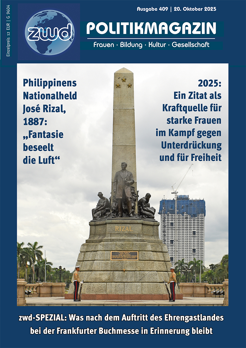 Wenn diese Ausgabe gedruckt und als pdf unsere ­Leserschaft erreicht, ist die Frankfurter Buchmesse 2025 schon wieder Geschichte. Mit unserer Berichterstattung über Ehrengastländer der Buchmesse ist es uns seit vielen Jahren wichtig, bildungs-, frauen- und gleichstellungspolitische Themen zu beleuchten. Das gilt auch für den diesjährigen Ehrengast Philippinen, der ein Zitat seines Nationalhelden José Rizal als Motto gewählt hatte; Fantasie beseelt die Luft“. Es steht als Anspruch und Kraftquelle für den Kampf starker Frauen, auch Autorinnen, gegen Unterdrückung und für Freiheit. Unsere Fragestellung will nicht nur den Blick auf das Gastland schärfen, sondern ebenso hinterfragen, welche Erfahrungen und Lernprozesse sich daraus für uns eröffnen können.