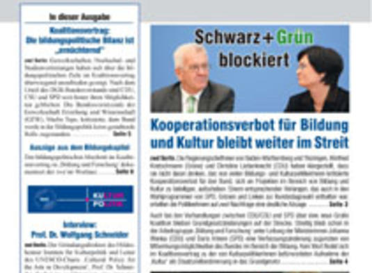 Das Titelthema: Kooperationsverbot für Bildung und Kultur bleibt weiter im Streit "Koalition verzichtet auf eine gestaltende Rolle des Bundes in der Bildungspolitik" Schulen müssen wieder die Kathedralen der Gesellschaft werden "In Deutschlands Zukunft investieren" - Das bildungspolitische Kapitel im Koalitionsvertrag von CDU, CSU und SPD für die 18. Legislaturperiode des Deutschen Bundestages mehr...