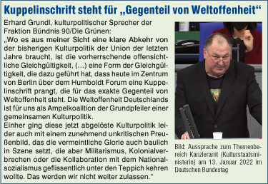 Das Statement von Erhard Grundl, kulturpolitischer Sprecher der grünen Bundestagsfaktion, zur Inschrift ist eindeutig: