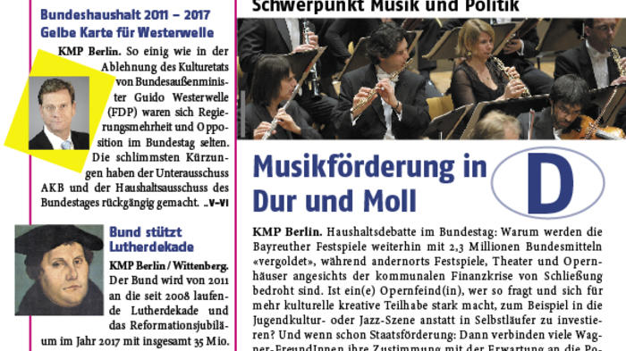 IN EIGENER SACHE: DAS NEUE ZWD-KULTURMAGAZIN : „KMP“: Kulturpolitik des Bundes und der Länder im Fokus Titelthema der Ausgabe Nr. 3: Musik und Politik | Der Kulturhaushalt der Bundes | Tarabya | Stiftung Flucht Vertreibung Versöhnung | Einheitsdenkmal mehr...