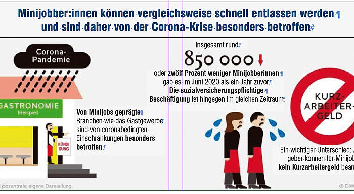 Minijobber*innen gehören nach dem Urteil des Deutschen Instituts für Wirtschaftsforschung (DIW) zu den Hauptverlierer*innen der Coronakrise auf dem Arbeitsmarkt. Minijobs sind prekäre Beschäftigungsverhältnisse. Sie haben eine ungenügende soziale Absicherung. Minijobs werden überwiegend von Frauen ausgeführt. Damit tragen diese Arbeitsverhältnisse zur geschlechtsspezifischen Spaltung des Arbeitsmarktes bei. Ein Bericht unseres Redaktionsmitglieds Dr. Dagmar Schlapeit-Beck. mehr...
