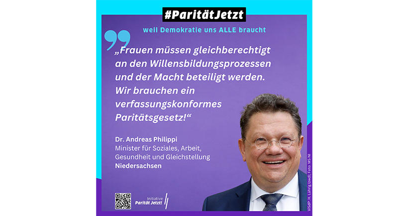 Der niedersächsische Minister für Soziales, Arbeit, Gesundheit und Gleichstellung Dr. Andreas Philippi hat die Kampagne "ParitätJetzt!" mit einem Testimonial-Statement unterstützt: "Frauen müssen gleichberechtigt an den Willensbildungsprozessen und der Macht beteiligt werden. Wir brauchen ein verfassungskonformes Paritätsgesetz!"