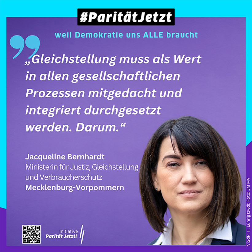 Die Ministerin für Justiz, Gleichstellung und Verbraucherschutz des Landes Mecklenburg-Vorpommern Jacqueline Bernhardt (LINKE) hat die Kampagne "ParitätJetzt!" mit einem Testimonial-Statement unterstützt: "Gleichstellung muss als Wert in allen geselölschaftlichen Prozessen mitgedacht und integriert durchgesetzt werden. Darum PARITÄTJETZT!"
