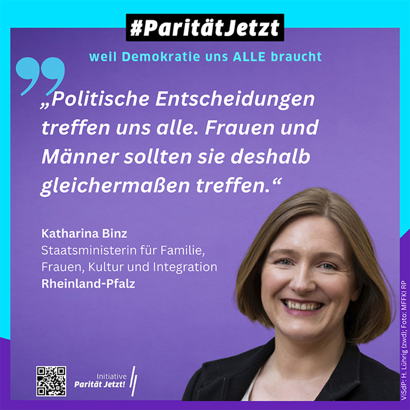 Die GRÜNEN-Politikerin Katharina Binz ist seit 18. Mai 2021 Ministerin im Kabinett der rheinland-pfälzischen Ministerpräsidentin Malu Dreyer (SPD). Während ihrer Studentinnen-Zeit (Abschluss Politikwissenschaft) war sie AStA-Vorsitzende in Mainz und gehörte zeitweilig dem Vorstand des „fzs“ (freier zusammenschluss von student*innenschaften) an. Ihr ministerieller Aufgabenbereich ist laut Koalitionsvertrag die Förderung der stärkeren Teilhabe von Frauen in Führungspositionen. Dazu zählt das Landes-Mentorin-Programm „Mehr Frauen an die Spitze“.