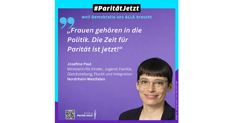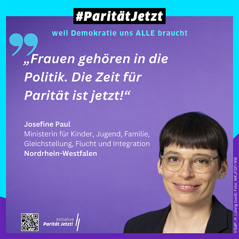 Die nordrhein-westfälische Ministerin für Kinder, Jugend, Familie, Gleichstellung, Flucht und Integration Josefine Paul (GRÜNE) war die erste Ressortchefin, die mit einem Testimonial-Statement die Kampagne "ParitätJetzt!" unterstützt hat: "Frauen gehören in die Politik. Die Zeit für Parität ist jetzt!"