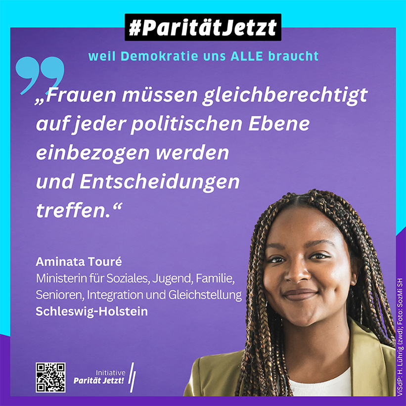Die in Neumünster geborene GRÜNEN-Politikerin Aminata Touré ist seit dem 29. Juni 2022 die erste afrodeutsche Ministerin (ihre Eltern flohen vor ihrer Geburt nach einem Putsch aus Mali). Sie gehört dem schwarz-grünen Kabinett von Regierungschef Daniel Günther (CDU) an und war zuvor schon von 2017 an Mitglied des schleswig-holsteinischen Landtags. Zu ihren Arbeitsschwerpunkten zählen gemäß Koalitionsvertrag die Novellierung des Landesgleichstellungsgesetzes und die Herstellung von Parität in Land und Kommunen.