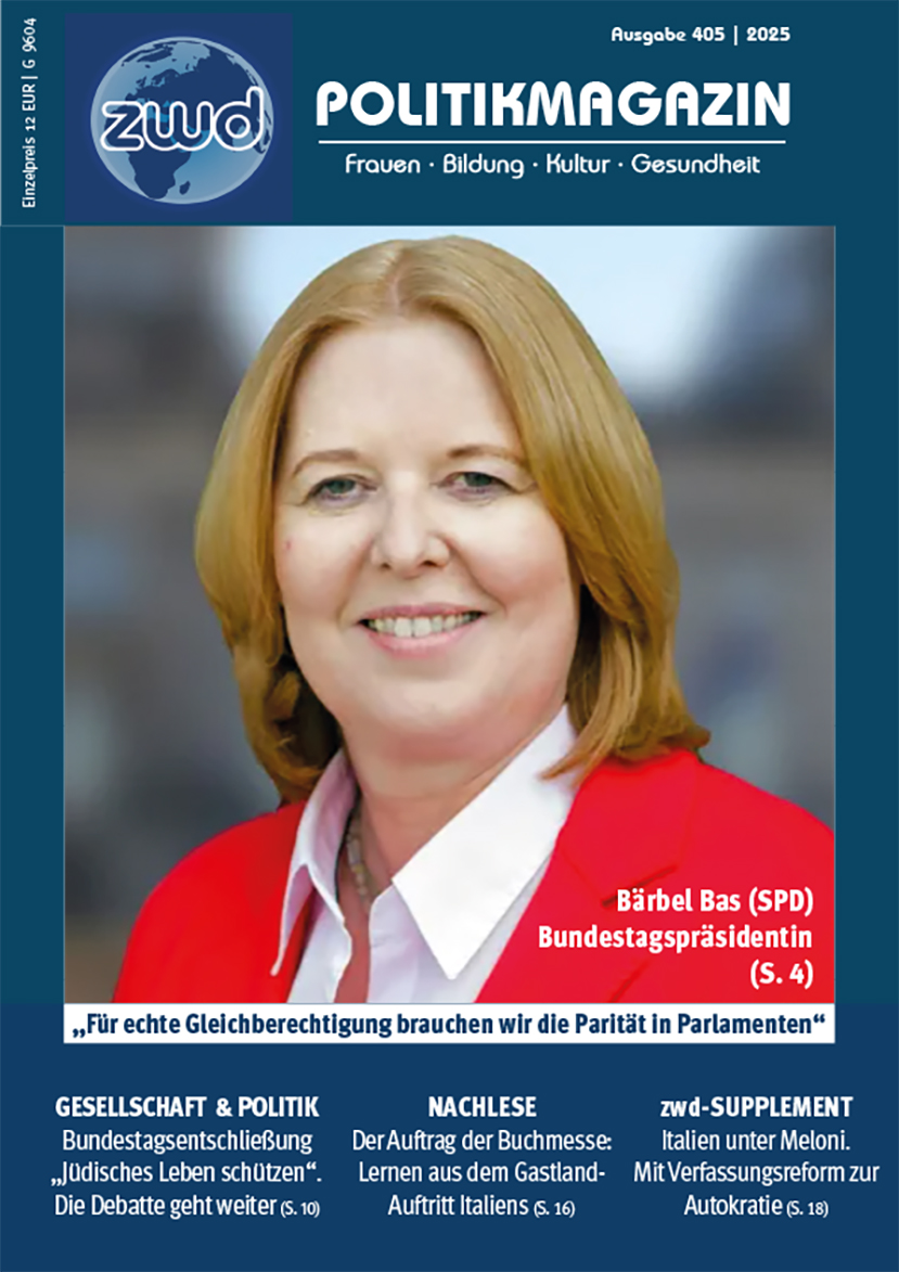 Das aktuelle zwd--POLITIKMAGAZIN, Ausgabe 405, hat in Anlehnung an unsere Digitalausgabe vom Oktober 2024 noch einmal das Thema Italien unter Meloni aufgegriffen. Es geht einerseits um die Bemühungen um wachsende rechtsideologische Einflussnahme des von der FdI-Chefin und Ministerpräsidentin geführten Regierungsbündnisses auf zentrale kulturelle Institutionen als auch andererseits um Sorge zu deren Umbauplänen für den Staat auf der südeuropäischen Halbinsel. Das Strickmuster entspricht dem von Autokraten, die ihre Macht durch antidemokratische Vergfassungsreformen zu festigen suchen. Geschwister im Geiste: Trump, Mus und Meloni. Portraits und Interviews runden das Bild über dortigen frauenpolitischen Bedingungen als auch für die Autorinnen ab.