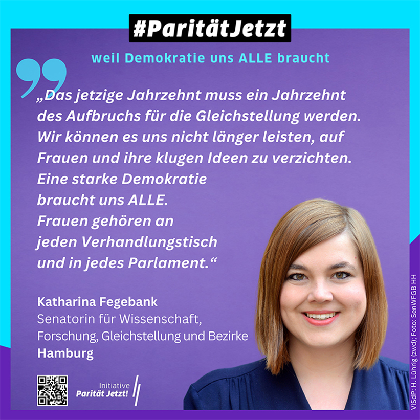 "Das jetzige Jahrzehnt muss ein Jahrzehnt des Aufbruchs für die Gleichstellung werden. Wir können uns nicht länger leisten, auf Frauen und ihre klugen Ideen zu verzichten. Eine starke Demokratie braucht uns ALLE."